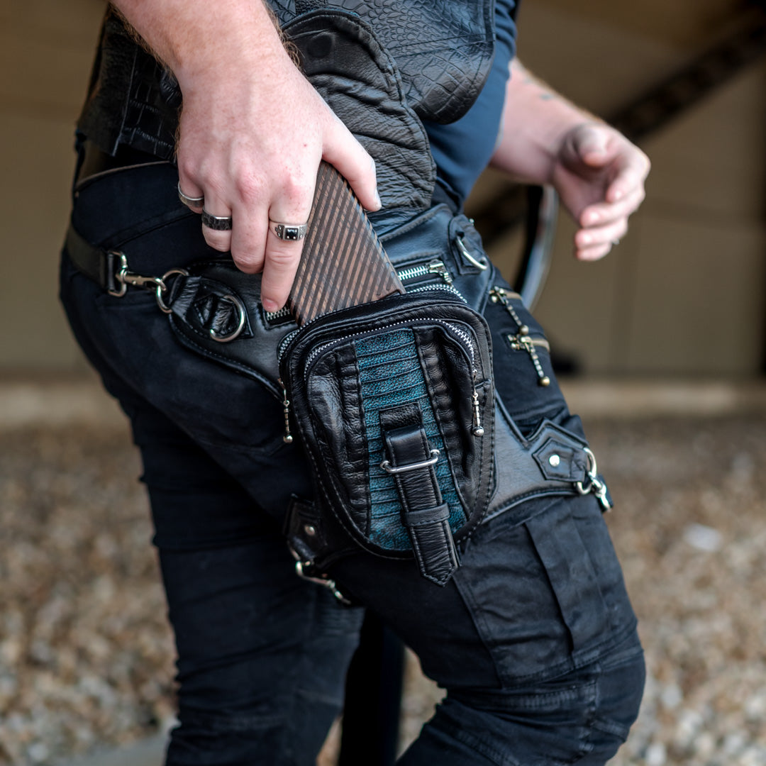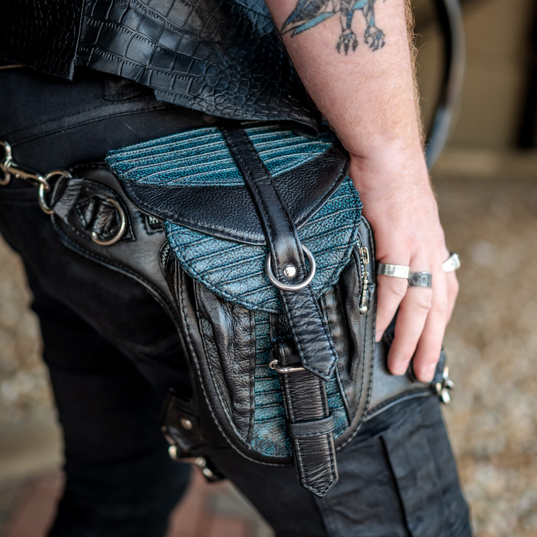 The Gunslinger Stash is a finely handcrafted leather satchel that can be worn on your hip, across your body like a satchel or purse, or converted into a backpack using the two smaller straps combined to make a second long strap. Perfect for travel, perfect for events like burning man, metal concerts, music festivals, or even a trip to wasteland weekend. Keep your stash safe in the hidden pocket (great for passports or cash) while keeping your phone and keys in the quick access zip pockets at the ready. And for those who partake, this is excellent for small form concealed carry.