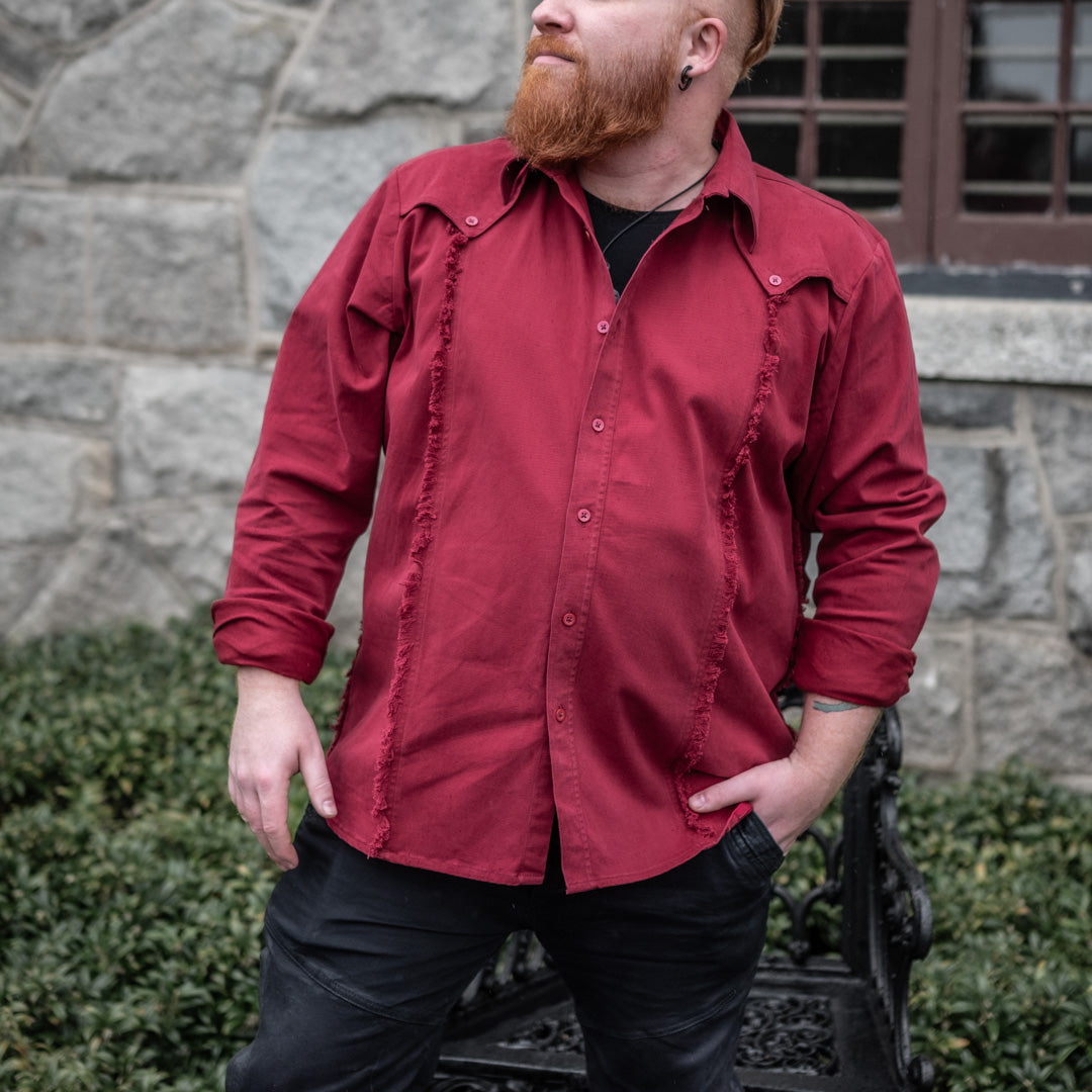This feature rich gothic button up is one of the finest designs we have ever launched in Men's Tops. The fabric is stretch, soft, and comfortable, while retaining a perfect vibrant hue. Avoid the machine dryer and keep it vibrant forever. The sleeve cuffs feature a bracer-like layered design perfection-stitched to hint at a post-apocalyptic style while still looking crisp and new after many wears. The sides of this shirt feature a strap and button system that can tailor or loosen the fit of this shirt on command, for those who may gain or lose body mass on occasion. Like our boots that lace-adjust, we thought of a shirt style that is worth the price, as it will grow or shrink a bit with you.