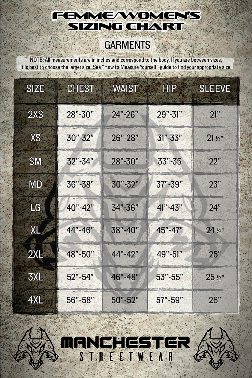 We have an awesome customer service team who lives and breathes this stuff. Email:sales@manchesterstreetwear.com