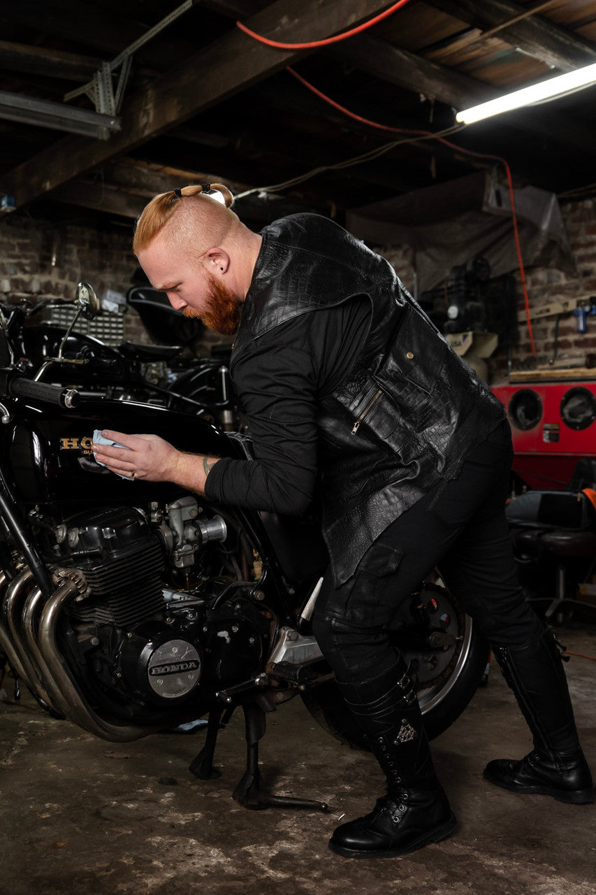 Loose fit by design with 9 total pockets, including two front pockets and two quick draw pockets on the flanks. Inspired by post-apocalyptic biker styles in movies and video games for the rogue adventurer. This genuine leather vest is sure to turn heads. Choose your tribe wisely, and make a statement at first impression. Durably handmade to outlast the apocalypse.