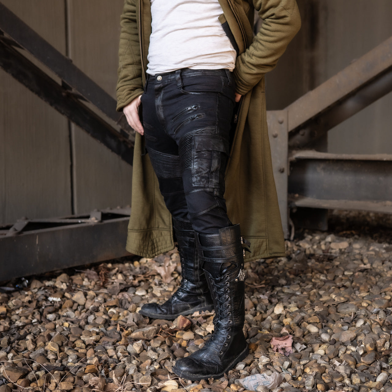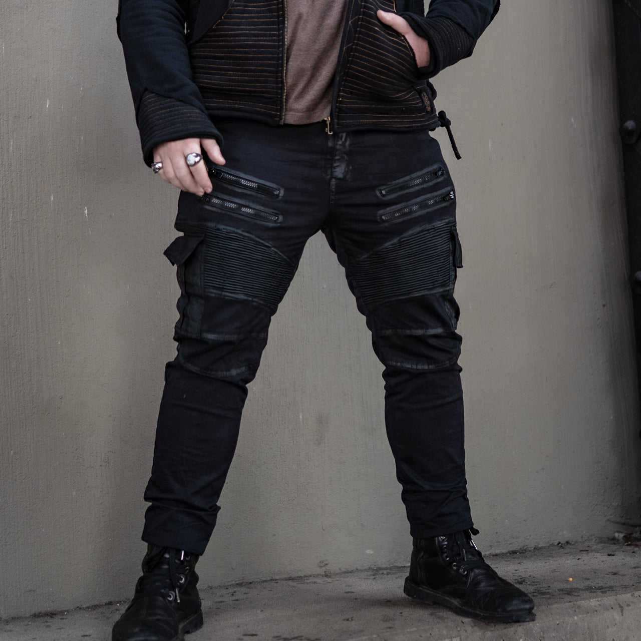 Jeans, reimagined for a sleek fit with plenty of stretch to move with you. Journey ready with 6 pockets for your essentials. Built to last from desert festivals to long rides on your motorcycle. A timeless distressed look with hints of post apocalyptic fiction that will only look better with age. Whether your style is road warrior, rock on stage, or the mysterious rider in the back of the room, we designed these to be the first bottoms you reach for every time.