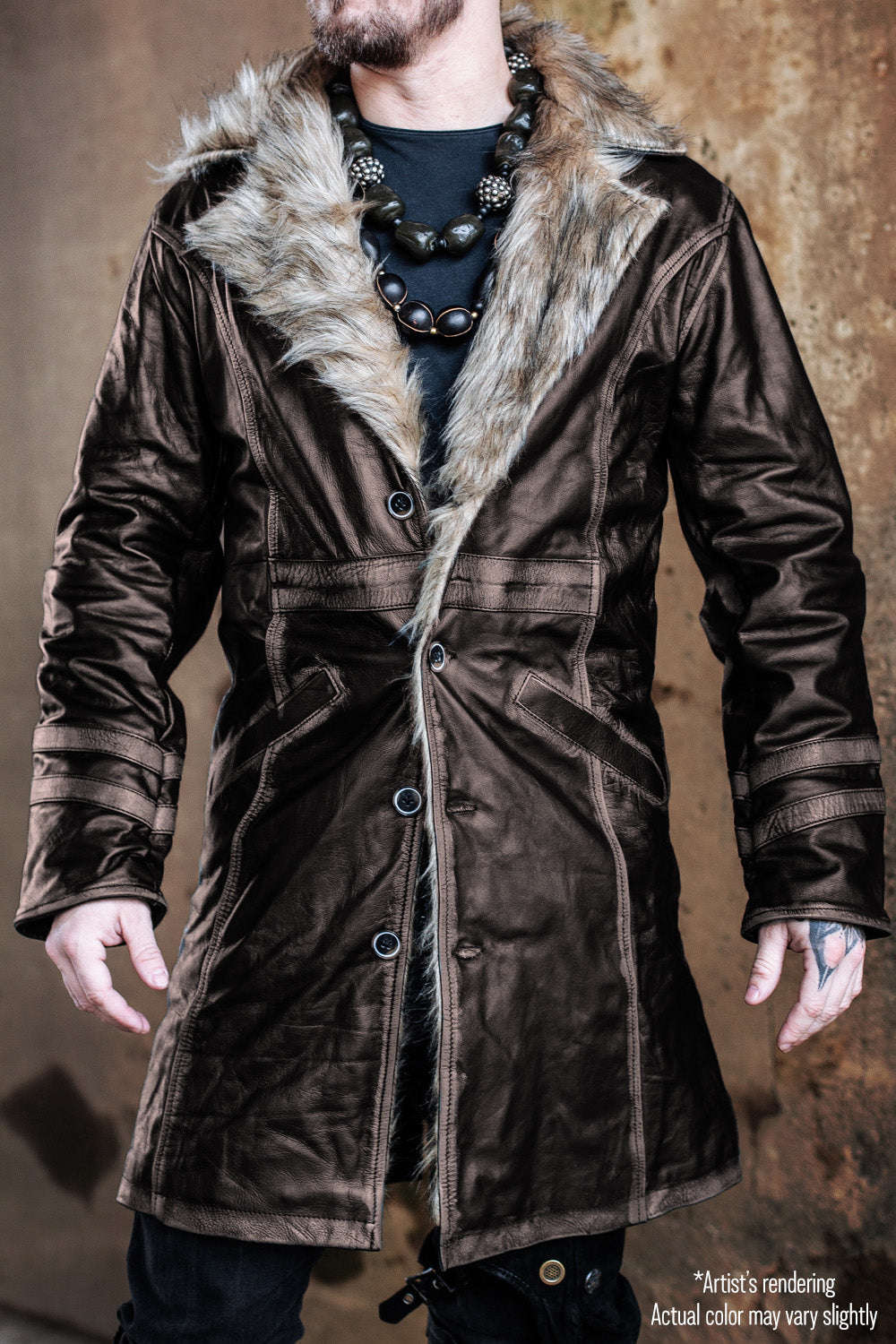 Our Havok Coat is hand-crafted from amazing quality selected leathers chosen for a specific flexibility in comfort and feel. The inside collar features a lush faux fur that provides an amazing look without agitation for the wearer. The torso lines on the coat are cut to contour to your body and highlight your best features. Inside is a warm fleece lining with an inside pocket to keep your valuables close. The back, shoulders, and arms are more open with consideration for movement and activity - one must be able to perform their most elaborate and powerful movements while wrapped in the power of their Havok Coat.