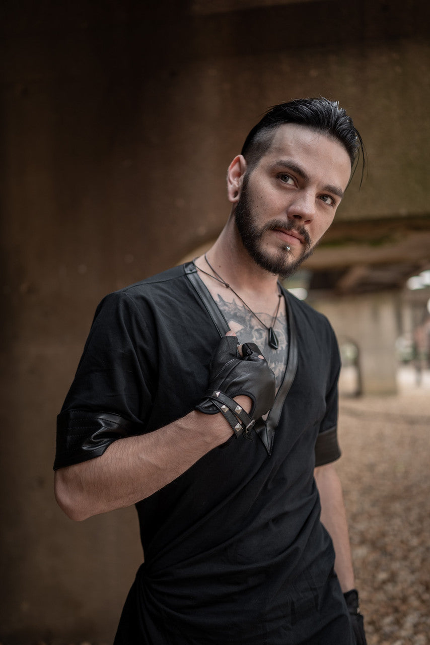 Do those who practice the dark arts wear robes and hooded tunics? No longer. Order 34 styles for swift movement and comfort, making a statement with dark fashion, but blending modern design elements enough to pass without notice on mundane streets. This gothic top features faux leather sleeves and a comfortable cotton blend body. Loose fitted for the dedicated adventurer. With the deep chest cut, this top was made with a necklace in mind, drawing the eye to your symbol or bauble of choice.