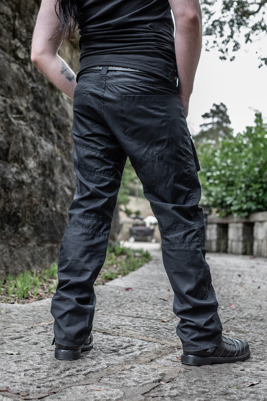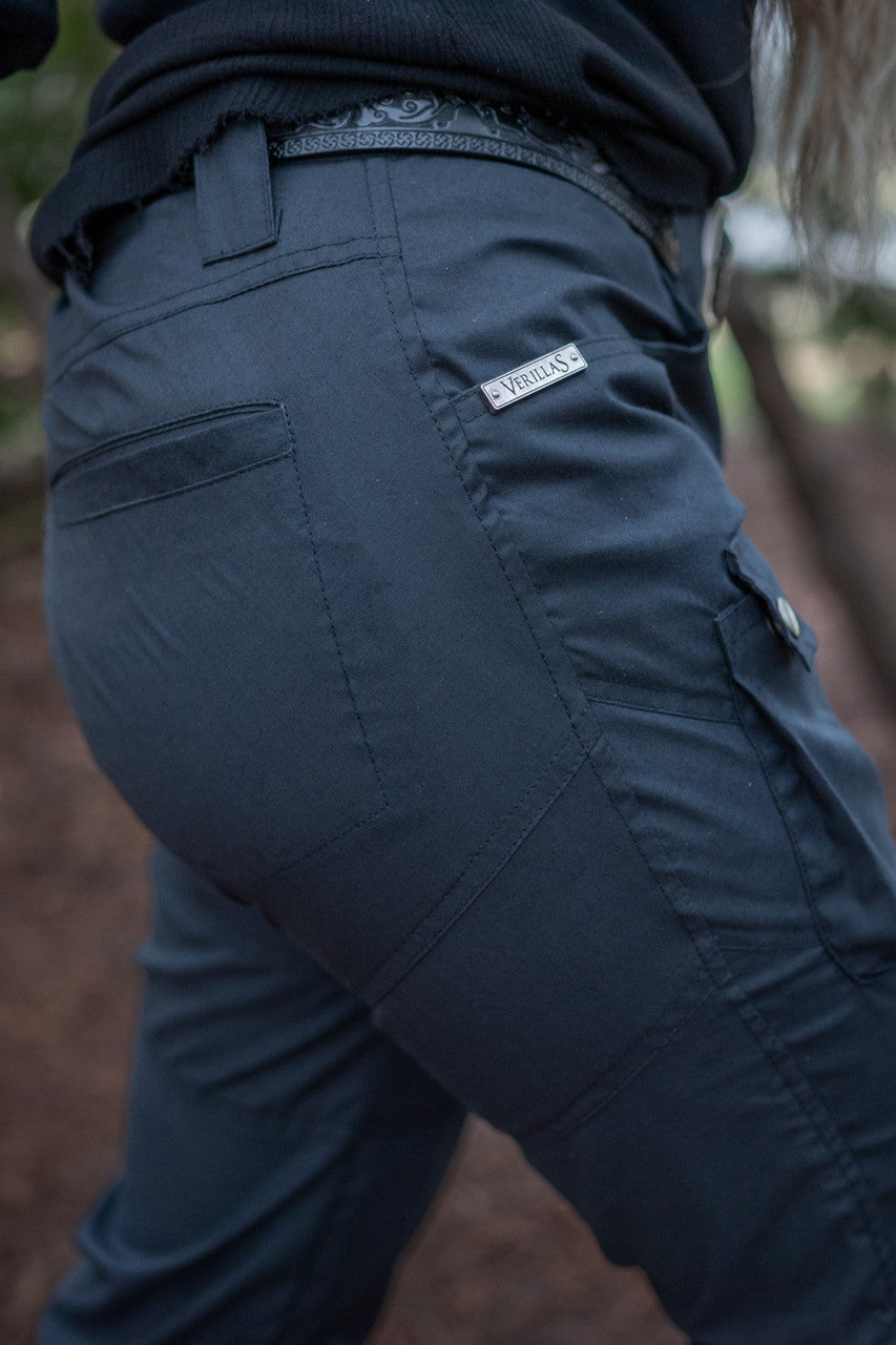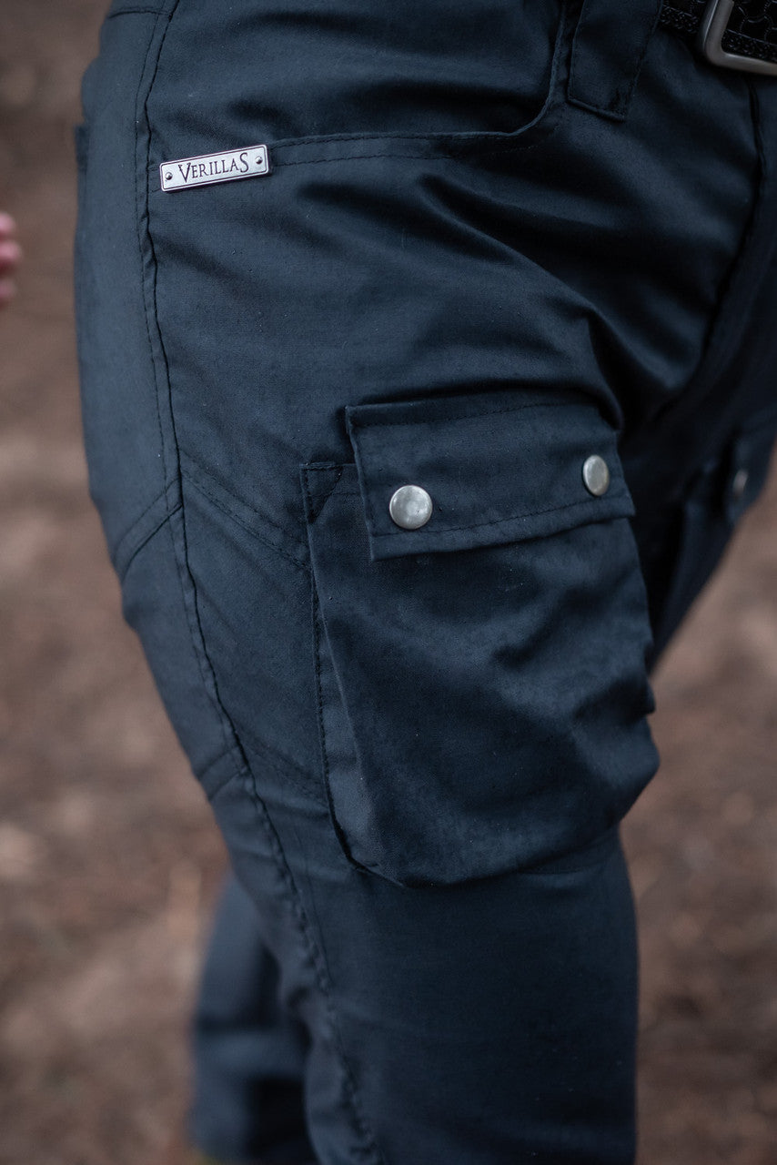 Do you always struggle to find the perfect hot weather pants? Struggle no more! Our V-Cargo Pants are breezy and lightweight, so you can enjoy every concert, festival, and faire the summer has to offer. They also have pockets for days, including two pockets with snap closures for keeping your most important items secure and NO false pockets. The knees are reinforced with a second layer of fabric so you don't have to sacrifice durability. These are the perfect outdoorsman pants, finally available in black for those of us with a darker aesthetic.