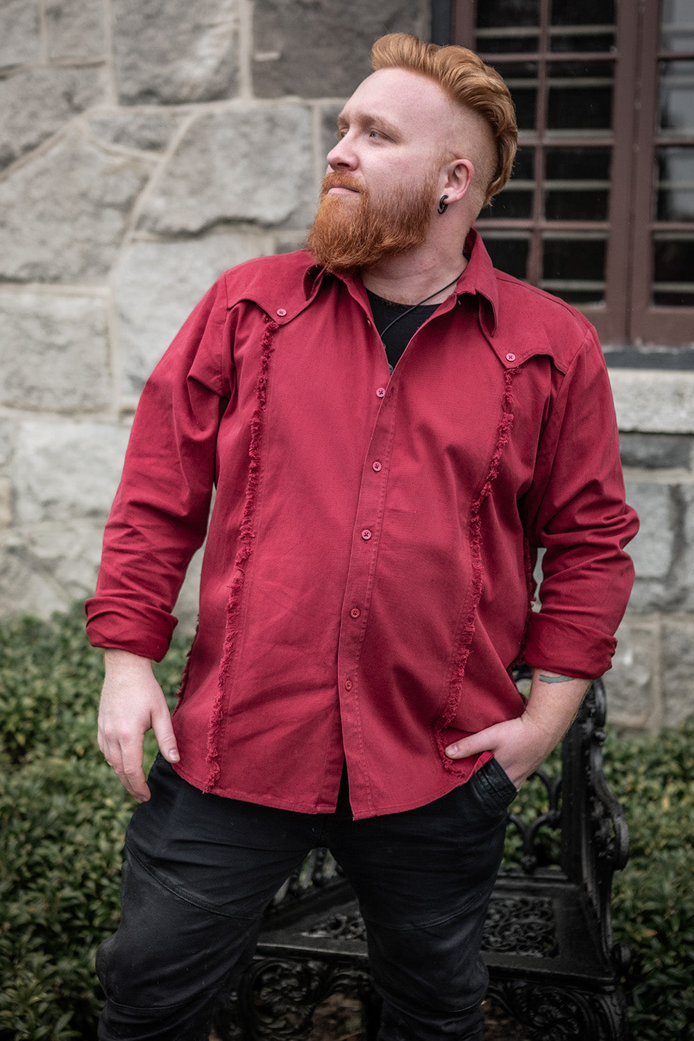 This feature rich gothic button up is one of the finest designs we have ever launched in Men's Tops. The fabric is stretch, soft, and comfortable, while retaining a perfect vibrant hue. Avoid the machine dryer and keep it vibrant forever. The sleeve cuffs feature a bracer-like layered design perfection-stitched to hint at a post-apocalyptic style while still looking crisp and new after many wears. The sides of this shirt feature a strap and button system that can tailor or loosen the fit of this shirt on command, for those who may gain or lose body mass on occasion. Like our boots that lace-adjust, we thought of a shirt style that is worth the price, as it will grow or shrink a bit with you.
