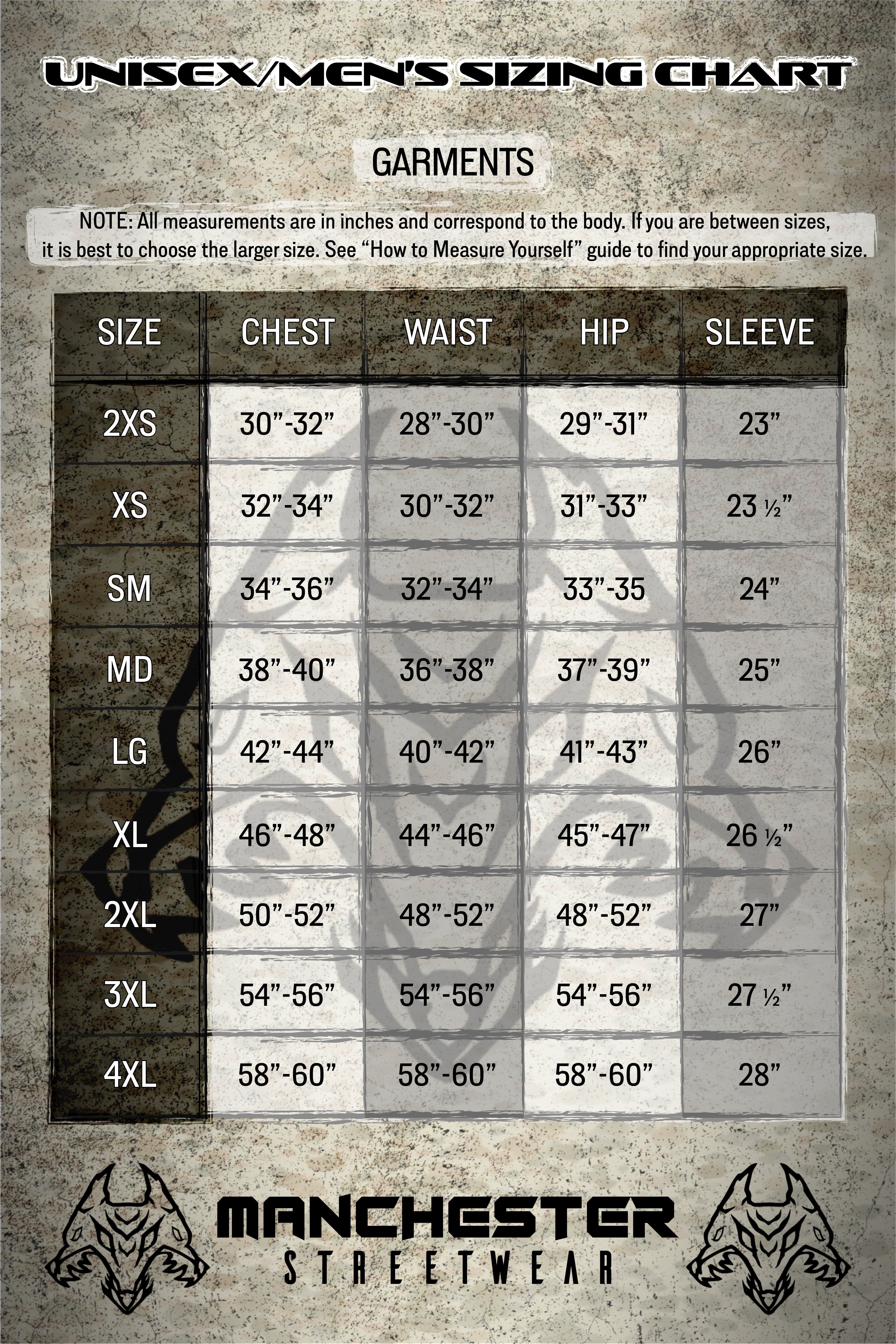 We have an awesome customer service team who lives and breathes this stuff. Email:sales@manchesterstreetwear.com